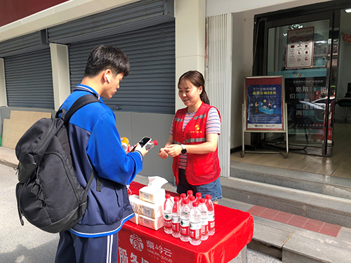 蓝田支公司在文姬路西安蓝田工业园高级中学设立服务点,为学生及家长通过乘凉避暑休息点,发放矿泉水、橡皮、铅笔、抽纸等,为高考学子们送上祝福与关心。