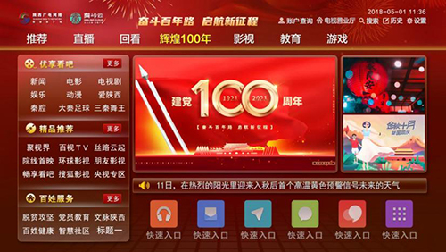 6月12日,公司为庆祝中国共产党建党100周年专门设计的“辉煌100年”红色主题九游(中国)面正式上线广电网络“秦岭云”和高清互动电视平台,与之配套的专题栏目也同步上线。