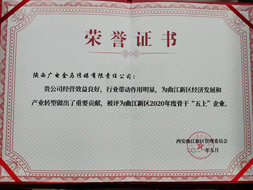 9月17日,西安曲江新区管理委员会召开曲江新区“五上”企业表彰暨发展座谈会,陕西广电金马传媒有限责任公司被评为曲江新区2020年度骨干“五上”企业。