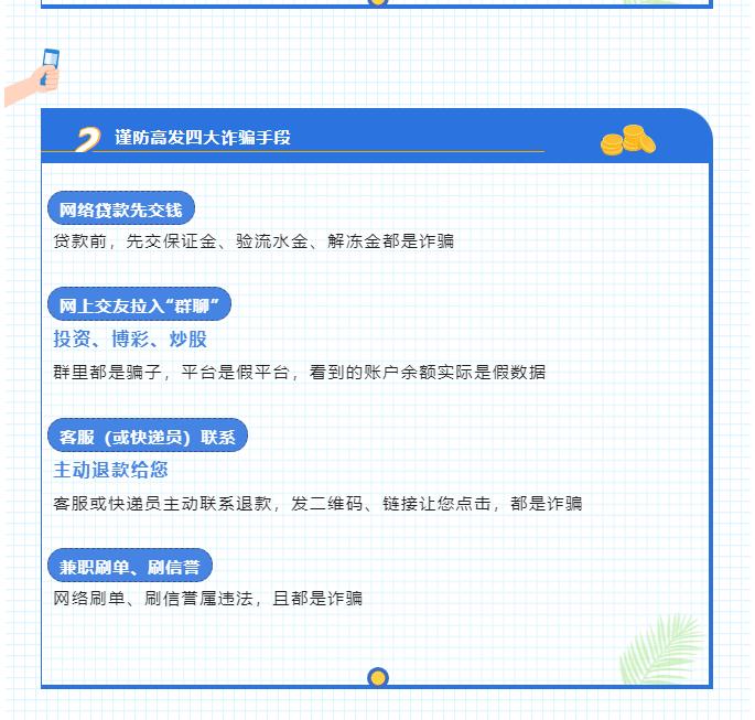 为进一步提高大家的安全防范意识,谨防电信网络诈骗,切实保障财产安全,九游官方网页版推出防范电信诈骗知识小课堂,呼吁大家时刻保持清醒头脑,提高警惕,理性应对诈骗情况,保护自身利益不被侵犯!