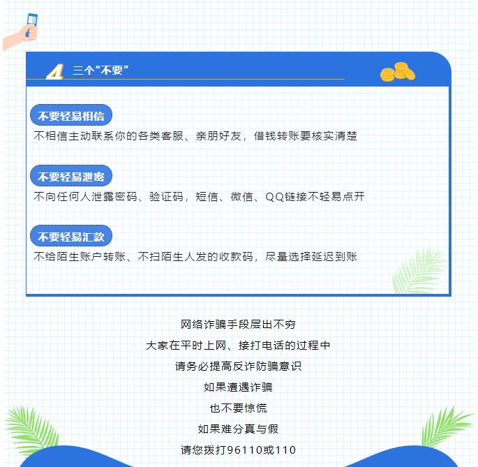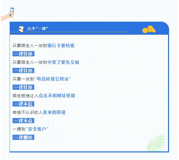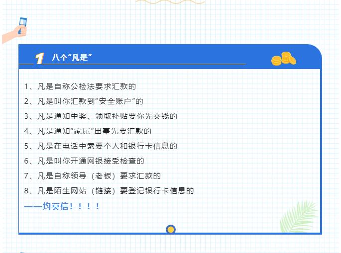本期内容为八个“凡是”,四大诈骗手段,六个“一律”,三个“不要”。