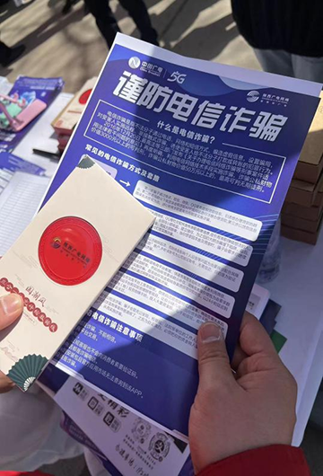 活动中,公司员工与省通信管理局志愿者、反诈民警、运营商工作人员等一起,通过播放反诈宣传片、悬挂反诈宣传海报、发放反诈宣传单、分析讲解电诈案例、开展反诈知识有奖问答等方式,为大学生讲解防范电信网络诈骗知识,宣传推广工信部“一证通查”服务及国家反诈中心 APP ,并鼓励前来参加活动的大学生共同参与到防诈、反诈志愿服务中,引导形成“反诈骗 懂防范 你我齐行动”的宣传热潮。