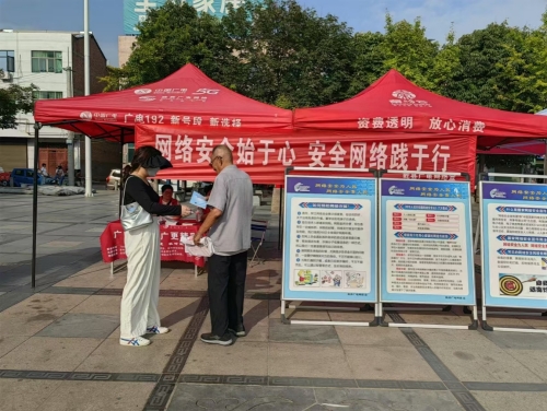 分公司本级紧扣“网络安全”主题,一方面组织工作人员在统一广场进行了布展,向广大群众发放网络安全相关宣传资料,普及网络安全、电信反诈等知识和技能;另一方面通过微信公众号、视频号发布了防范电信诈骗小知识,在市区营业厅LED大屏滚动播放第十一届网络安全宣传周核心内容,在业务演示屏上播放电信反诈宣传视频短片,进一步提升市区居民的网络安全意识和技能,积极营造网络安全社会氛围。