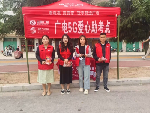 乾县支公司在乾县二中考点设置“助力高考”志愿服务站,为考生及家长提供休息区、矿泉水、夏凉扇等,并积极宣传广电5G业务与“十心服务”。