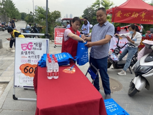 三原支公司在考场周边设置多个爱心助考点,为考生加油鼓劲,为考生家长发放装有矿泉水和广电5G业务宣传彩页的手提袋,并积极宣传反诈知识,提供贴心服务。